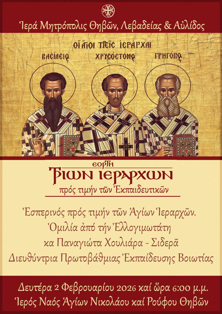 Λόγω των δυσμενών καιρικών συνθηκών η εκδήλωση στην πόλη των Θηβών για τους Εκπαιδευτικούς των επαρχιών Θηβών και Αυλίδος, που ήταν προγραμματισμένη για σήμερα 26 Ιανουαρίου, αναβάλλεται και θα πραγματοποιηθεί τη Δευτέρα 2 Φεβρουαρίου 2026 και ώρα 6:00 μ.μ.
